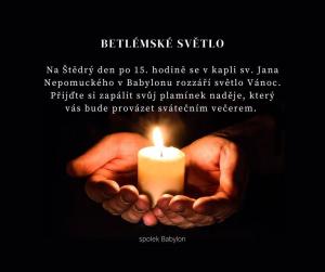 Na Štědrý den po 15. hodině se v kapli sv. Jana Nepomuckého v Babylonu rozzáří světlo Vánoc. Přijďtě si zapálit svůj plamínek naděje, který vás bude provázet svátečním večerem.