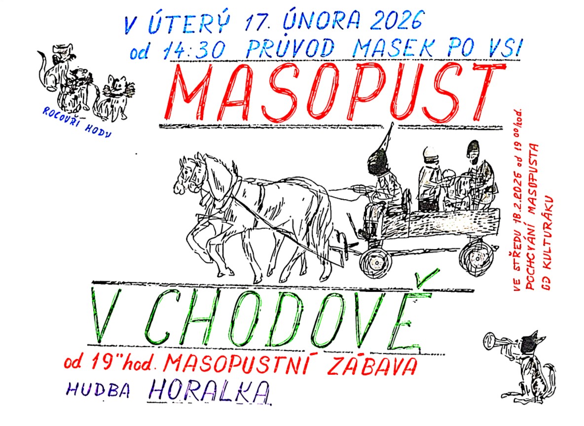 V Chodově se koná tradiční masopust, který zahájí v úterý 17. února od 14:30 průvod masek. V rámci akce proběhne také Masopustní zábava, která začne v 19:00 a k tanci a poslechu bude hrát kapela Horalka. Následující den, ve středu 18. února, se od 19:00 uskuteční pochování Masopusta, sraz je před kulturákem. Srdečně zveme všechny k účasti na těchto oblíbených tradicích.